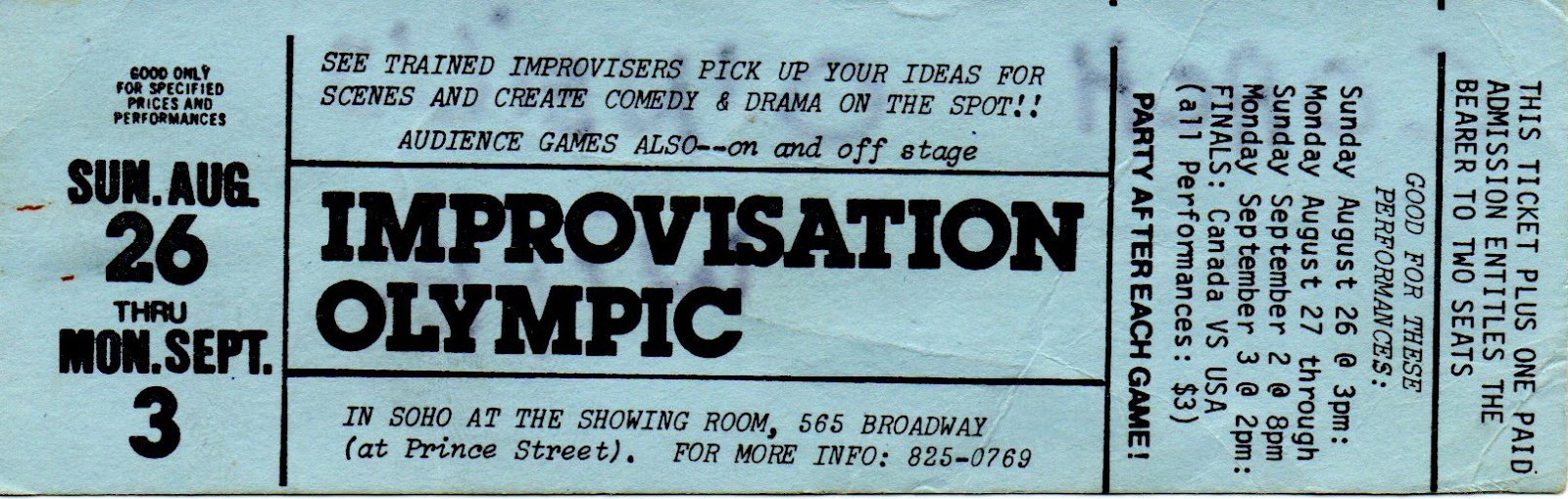 The Canadian Olympic Games (CIG) started in New York. Chicago City Limits, located far west on 42nd St, invited us to hold international matches on their stage. Only Canada and the USA were involved. Ottawa high school students were guided by Willie Wyllie, who later ran the Stage Fright team. The Canadian kids spent the night of the match at the home of Barbara Caporale’s parents, where there was just enough rug and sofa room to accommodate 20 boys and girls. We all discovered that their experience of travel, comradeship and performance was intoxicating. These elements propel CIG to this day.